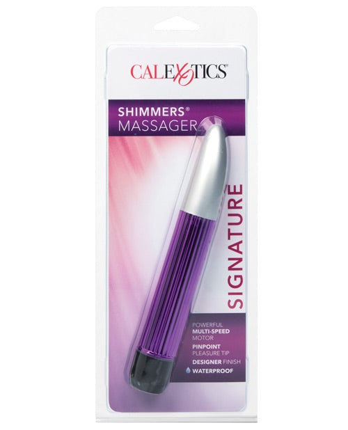 This is the ultimate massager for today's woman! The Shimmers Waterproof Massager has powerful vibrations that resonate throughout. This designer massager has a brushed chrome finish at the tip of the vibe while the shaft is vertically corrugated and has a metallic pink finish. This multi-speed vibe is suitable for use in or out of the water. Vibrator measures 6.5" long with a diameter of 1.125". Two AA batteries, not included, are needed for vibrations. Shimmer your way to satisfaction!