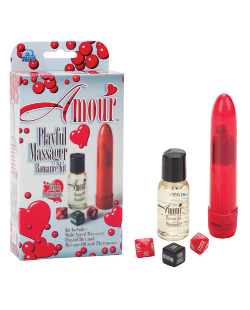 Keep the romance going all night long with the Amour Playful Massager Romance Kit from Cal Exotics. It has a powerful multi-speed massager, 3 playful dice, 1 oz of Amour Massage Oil with Pheromones and Antioxidants. Massager requires 1 AA battery. 5.25"x 1" (massager).