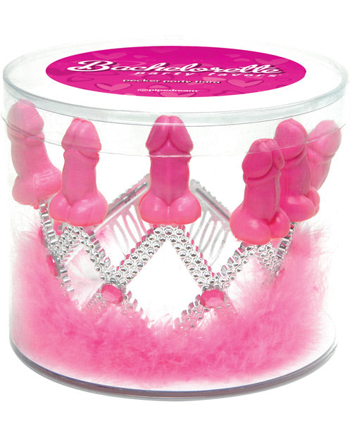 Make the Girl's Last Night Out an unforgettable one with this hilarious Bachelorette Pecker Party Crown! Silver color plastic crown is lined in pink marabou. Each point of the crown is topped with a silly pink plastic pecker. One size fits most. It's not a party without a Pecker Party Crown!