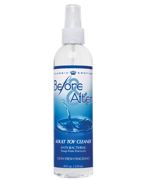 Practice safer sex with Before & After Adult Toy Cleaner! Kill bacteria while keeping your toys fresh. This toy cleaner is nonirritating and safe to use when very delicate tissue is involved. Effectively sanitize all your favorite toys and help reduce the spread of germs. Clear plastic bottle with spray pump holds 4 oz. of adult toy cleaner. Use it to get rid of that new toy smell. Use it before playtime to make sure your toy is sanitary and fresh. Use it after to keep all your toys in pristine condition!