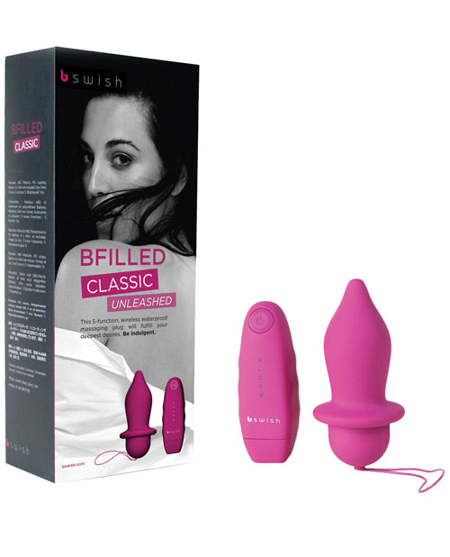 Open new doors with the Bfilled Classic Unleashed wireless remote massaging plug. Thoughtfully designed with a tapered tip that's ideal for beginners and an unobtrusive base, this petite body-safe plug will wow you with hours of powerful 5-function waterproof pleasure. Take control with the ergonomically designed wireless remote, which is lit up by a white light for easy play in the dark, or hand off to a partner for unexpected pleasure in private or in public. However and wherever you choose, the Bfilled Classic Unleashed will pleasure and delight. The Bfilled Classic Unleashed is made from nonporous, body-safe PU coated ABS plastic - making it easy to clean and versatile when it comes to choosing lubricants. While the plug is safe for waterproof fun, the remote is best left out of the tub. Materials: ABS with PU coat. Dimensions 1.45" (3.6 cm) girth, 4" (10.16 cm) length. Powered by 4x AAA (not included).