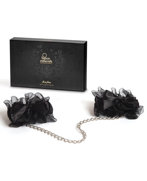 Bijoux Indiscrets Frou Frou - Organza handcuffs. The mystery of dominating intimacy has the feeling of organza. FrouFrou combines the richness of organza is delicately blended with the silky softness of satin. The cuffs are designed for tantalizing acts of seduction, to make even the sexiest fantasy a reality. Content: satin and organza handcuffs.