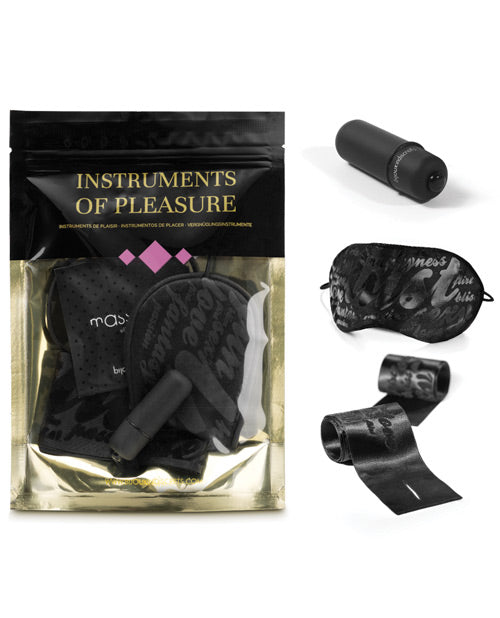 A vibrant touch that triggers desireà ! Deep in the shadows, lives pure seduction. Do you dare? Elements of extreme sensuality with wich to carry out some of the most intense games. Content: satin ties, satin mask, silicone gel and vibrating bullet. From Bijoux Indiscrets.