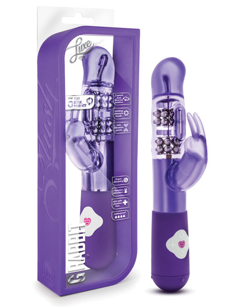 Meet a smarter new breed of rabbit vibrators. Blush Luxe G Rabbit delivers powerful dual point vibrations with its super-soft rabbit stimulator and raised bullet vibe located on the front of the shaft. Both points of vibration offer 7 vibrating functions. G Rabbit boasts 3-speed multi-directional rotating beads, and features a curved head shaped for perfect g-spot stimulation. The powerful high-tech motor functions quietly and the waterproof body is made of soft phthalate-free elastomer. Where pleasure and technology combine, G Rabbit will meet all of your demands. Length: 10.25 . Insertable: 4.5 . Width: 1.5 . Circumference: 4.5 . Weight: 13.3 ounces.