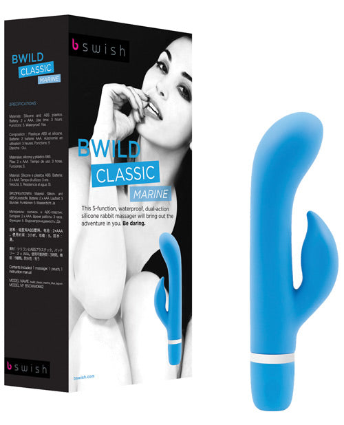 B Swish brings you this gorgeous, delightfully manageable 5-function silicone rabbit massager with 2 individual motors, ready for waterproof fun. With a slim tilted shaft and a smooth but precise tickler the Bwild Classic Marine will satisfy the solo pleasure seeker, though it's certainly suited to couple-geared scenarios too! The Bwild Classic Marine is 6" of dual-motor power yet extremely silent and perfect for shared houses. Featuring an up-angled smooth shaft with a uniquely contoured head, the shape naturally targets and massages the nerve-ending rich g-spot. The 5-functions and dual motors are cycled through with the click of a single button at the base of the massager. The buttons lit by a white light for easy play in the dark. Made from hygienic, nonporous silicone materials, and ABS plastics, the Bwild Classic Marine is extremely body friendly and amazingly sensual on contact. The unique material warms quickly to match ones body heat while offering a silky glide. Best used with a quality water based lubricant and clean with soap and warm water when finished playing.