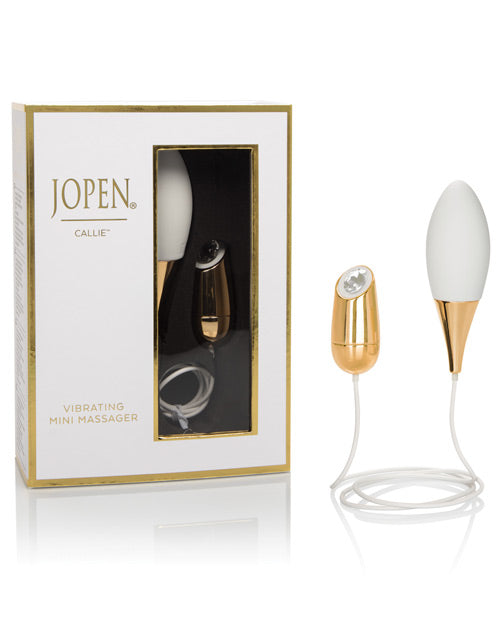 Modern, fluid shapes and designer accents characterize this luxurious new collection of JOPEN massagers. Designed to bring elegance to the bedroom, each Callie product encompasses strength, power and style while providing the superior pleasure and quality found in JOPEN products. Virtually seamless and Satin Finish Silicone. Luxury gemstone easy push button operation. USB rechargeable (charging cord included). 100% Waterproof. Massager will run for: 1 Hour on high speed 2 Hours on low speed Complete charge in 2 hours 4.25" x 1.5"/10.75 cm x 3.75 cm (massager) 2.5" x 1.25"/6.25 cm x 3.25 cm (controller) ¢ 7 functions of intense vibration, pulsation, and escalation.