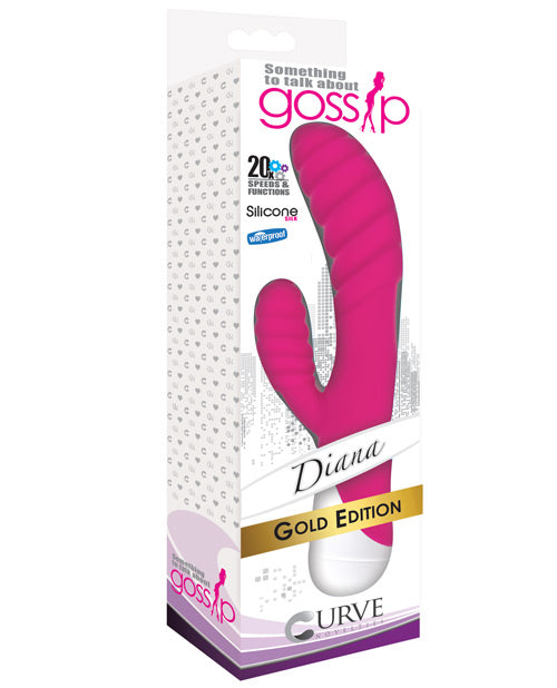 Curve Novelties Gossip Diana features 3 speeds and 17 functions. Dual motors in shaft and stimulator deliver double the pleasure. Thickly ringed for deeper sensation. Ultra premium SiliconeSilk feels like velvet on your skin. Virtually seamless with a satiny smooth LushTouch handle. Dimensions: 8.375" X 1.5". Requires 2 AA batteries. From Curve Novelties. Magenta.