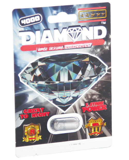 Take one Diamond 4000 capsule 30 minutes before sex to help libido, energy and sexual performance. Diamond can also be used on a regular basis to maintain optional condition of Diamond readiness before sex. Caution: Do not take more than 1 capsule every 24 hours. Do not consume with alcohol. 1 Capsule Blister.
