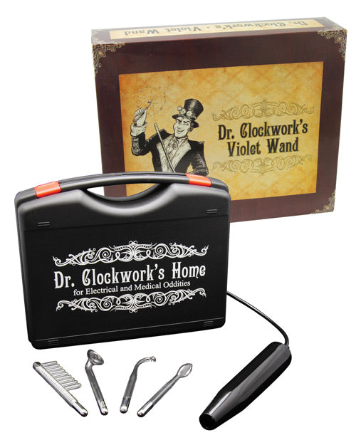 Dr. Clockwork's Violet Wand Kit. Our solid state travel kit comes with a Dr. Clockwork Solid State violet wand, three electrodes, and our travel case. The petite, hard plastic case measures a scant 9 1/2" x 7 1/2" x 2 1/2" making it the perfect travel toy that you can toss in a toy bag or check in your luggage for long distance trips. No longer do you need to carry around a suitcase full of gear.