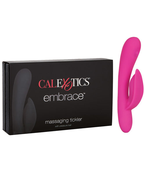 The Embrace Massaging Tickler is a powerful silicone dual massager with triple motors with 7 functions of shaft vibration, pulsation and escalation. The 3-speed rolling pleasure ball with intense massaging action in the shaft. State-of-the-art memory chip resumes on last function used and is USB rechargeable (charging cord included). Easy push button control - hold each button independently for 3 seconds to turn on or off. Materials: Silicone (massager), ABS with Silver Plating (decor). Dimensions: 5" x 1.25"/12.75 cm x 3.25 cm (shaft), 2.5" x 1"/6.25 cm x 2.5 cm (stimulator).