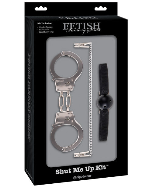 Turn your bedroom into an erotic playground with this incredible first-timers Shut Me Up Kit. Everything you need to explore your fetish fantasies is included in this kit! The possibilities are endless...and so is the fun! Kit Includes: Nipple Clamps, Handcuffs, Breathable Gag. From Pipedream.