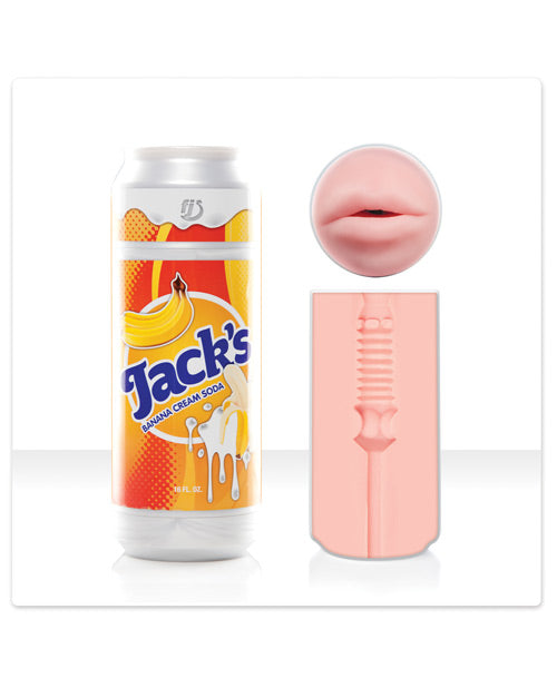 Jack's Soda: Banana Cream, Fleshjack's variation of the Sex In A Can product line, features an exclusive "Mini" Mouth orifice and Mini-Swallow texture not found on any other Fleshjack product. Jack's Soda products feature the same patented Superskin material as original Fleshjack units and are just as easy to use and clean. Includes the Banana Cream Sleeve with Mini-Swallow texture & a custom, silver-colored and labeled plastic case.