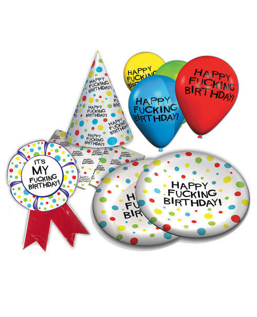 Get everything you need for the Happiest Fucking Birthday ever with the Happy Fucking Birthday Party Pack. This x-rated, adult party supply set features a ribbon, balloons, party hats, 7" plates and napkins for a party of eight. Each piece is printed with,   Happy Fucking Birthday   amidst cheery, colorful polka dots, so the guest of honor knows the true sentiment behind the birthday wishes.