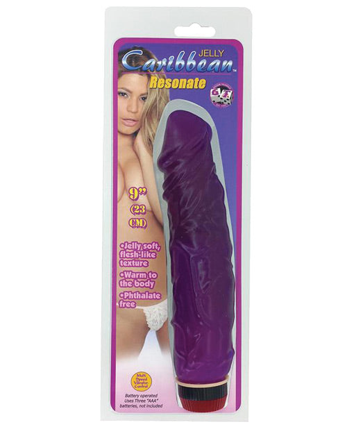 Golden Triangle Resonate Purple. Jelly soft, life like...warm to body, this will resonate with you or your lover for hours. Multi-speed vibrator, shaped just like a penis, 9" of usable length, perfect fit, stimulation and impact. You will love your Jelly Caribbean adult toy for all your sexual activities. Imagine all the things you can do with this top-of-the-line vibrator! Length: 9 1/4 in. Insertable Length: 8 in. Max Diameter: 1 7/8 in. Min Diameter: 1 1/2 in. Uses 2 AA batteries (not included).