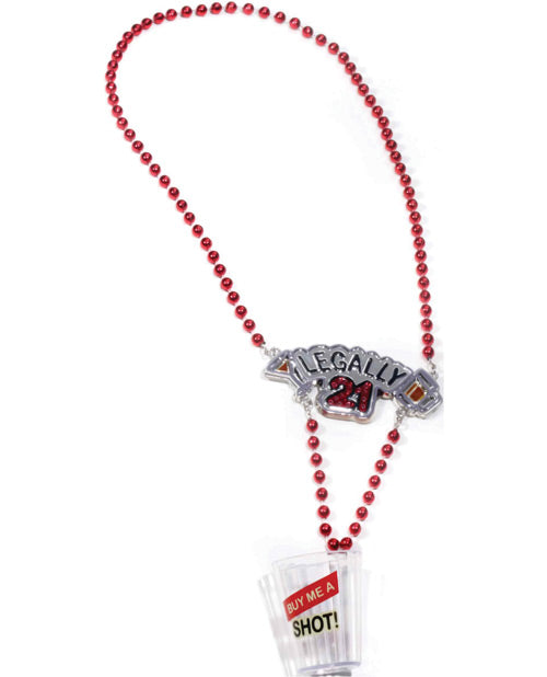 Celebrate your 21st milestone with style, fun and shots. The Legally 21 Shot Glass Necklace from Forum Novelties will help you and the gals get your party on! This beaded necklace features a charm that reads "Legally 21" and an attached shot glass that reads "Buy Me a Shot!"