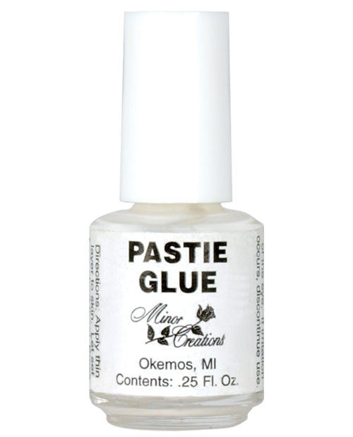 Keep those pesky pasties in place! Just a thin layer of Minor Creations Pastie Glue secures your cover up. Glass bottle holds .25 oz. of liquid glue. Glue brush is secured to inside of twist-off lid. Pick up Minor Creations Pastie Glue and twirl away!