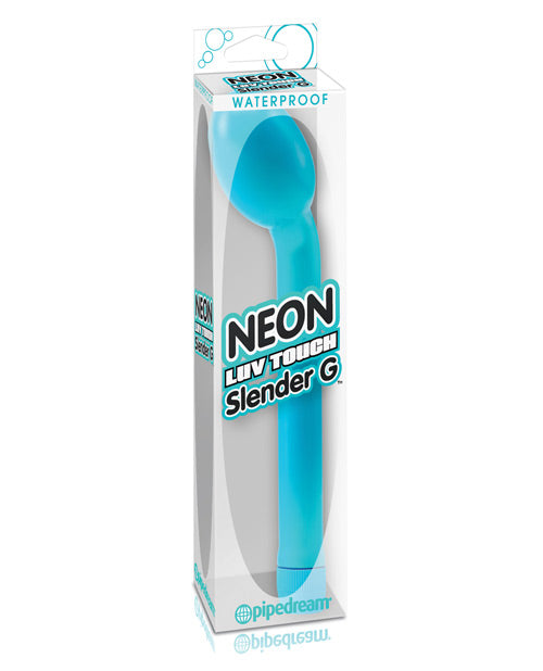 Get just the right touch of satisfaction with this incredible Neon Luv Touch Slender G vibe from Pipedream. Lined with our super-silky Luv Touch coating, this powerful multispeed vibe has an ergonomically curved tip for amazing g-spot stimulation. Choose a speed that's right for you and let the silent vibrations whisk you away. Try it in the shower or spa and turn bath time into pleasure time! Use plenty of Moist lube for an extra wet, extra wild encounter. 8". Waterproof, multispeed. Requires 2 AAA batteries (not included).
