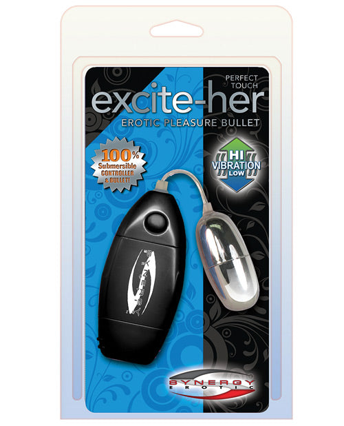 Great things come in small, shiny packages! Exotic pleasure is packed inside this silver bullet. Use this waterproof adult toy in or out of the tub for exquisite sensations that will provide orgasmic thrills. Enjoy two speeds of satisfaction with the touch of a single button located on the plastic battery pack. The Excite-Her Erotic Pleasure Bullet is 2.25" long with a diameter of 1". It has a heavy duty reinforced cord for easy retrieval. Use 2 AA batteries, not included, for exciting sensations. Erotic pleasure for passionate playtime!