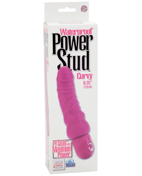 Waterproof Power Stud Curvy Dong from Cal Exotics. Power Stud...Traditional designs with a contemporary flair. Body safe, push-button 3-speed controller, 100% waterproof. Soft and flexible vibrators. 3-speed. Power packed. Push button control. Phthalate-Free PVC (vibrator) ABS/ABS with PU Cote (cap) ABS with Silver Plating (decor). 2 AA batteries. 6.75" x 2"/17.25 cm x 5 cm.