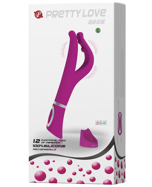 Pretty Love Basil Dual Vibrator is rechargeable and features 12 functions of vibration. Separate on/off and vibration button make for easy controls. Measures a total of 250 MM long with a 105MM insertable length. Includes charger and charging stand. Made from 100 percent silicone. From Liaoyang Baile Health Care Product Co., Ltd. 1 year manufacturer warranty