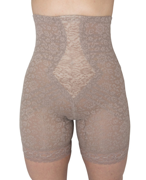 High Waist Long Leg Shapewear from Rago. Features an exclusive invisinet tummy tamer shaping panel with flexible front and side boning and a convenient split crotch opening. The exclusive power circle inner contour bands give the wearer the shape they desire. The gripper stretch lace on the bottom of the legs helps with fit and also adds sexy detail.