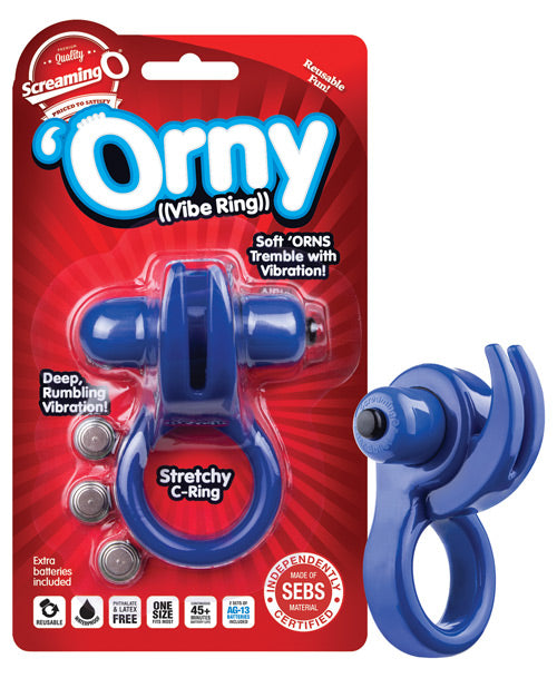 The 'Orny vibe ring gets couples hot and heavy fast with a unique shape specially designed for a dramatically different orgasm. The 'Orny is powered by the famous Vooom(TM) Bullet, a new low-pitch mini vibe that vibrates with a deep, rumbling sensation unlike anything you've ever felt. This one-size-fits-most cock ring is equipped with two soft, flexible "horns" that cradle the clitoris and tremble and flutter against every erogenous zone they touch. With the push of a button, the 'Orny sends powerful vibration to their tips all while providing an enhanced experience for him. Simply stretch the ring around the penis or both the penis and testicles with the vibrating "horns" positioned on top to assure the most effective experience. Made of lab-tested, body-safe SEBS material, the 'Orny matches powerful erection enhancement with extrasensory stimulation specially designed to satisfy every carnal craving! From Screaming O Products.