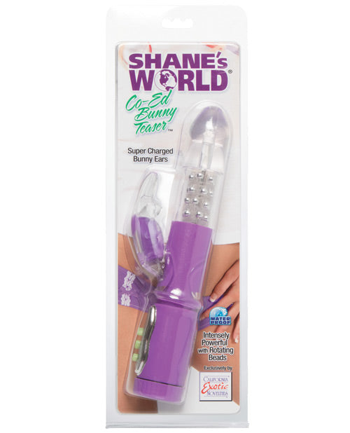 The Shane's World Co-Ed Bunny Teaser from California Exotics is a super-charged, intensely powerful, multi-function total arouser with 2 speeds of clitoral vibration. The 4.5" shaft houses 4 rows of non-jamming pleasure beads, it has reversible rotation and is multi-functional. The push button control offers several different combinations for pleasure bead rotation and clitoral stimulation. Features include Slimline shaft with tickling bunny ears; glow-in-the-dark push button control; TPE (shaft), ABS with Satin Finish/PU Cote (control), Silicone (buttons) ABS (beads); waterproof. Requires 4 AAA batteries (not included). 4.5" x 1.25"/ 11 cm x 3 cm (shaft); 3" x 1"/ 8 cm x 3 cm (bunny). Purple.