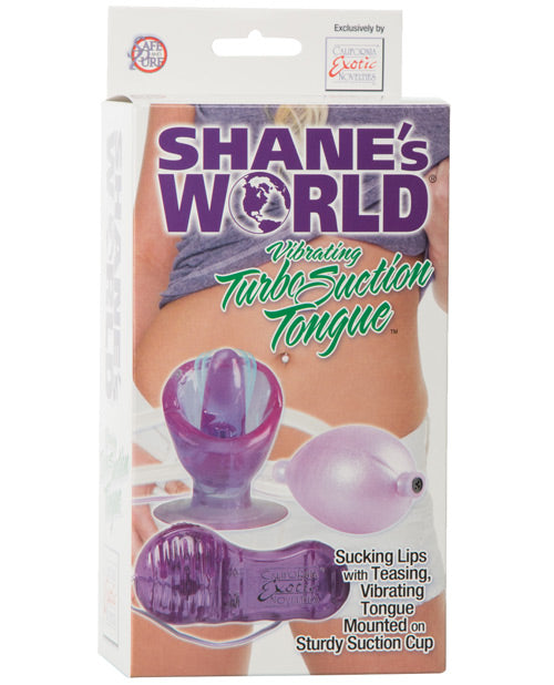 Shane's World Vibrating Turbo Suction Tongue features soft, sucking lips and a vibrating tongue. Comes with a sturdy suction base and EZ squeeze hand pump. Offers multiple speeds. Made from phthalate-free PVC (teaser) and ABS (controller). Requires 2 AA batteries. From Cal Exotics.