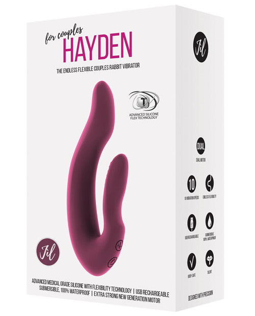 Jil brings sensual appearance unlike any other. Hayden is a very nimble couples toy that has been designed with the utmost precision, making it perfect to fulfill your deepest desires. We have used a new technology to develop this medical grade silicone toy, which gives Hayden softness and endless flexibility to adjust perfectly to the shape of your body. The two super quiet, yet very powerful 10-speed motors provide satisfying vaginal and clitoral stimulation that will work even in the deepest waters. You can also operate the controls with one hand! Because of its ergonomic shape it's also perfect for partner play and you will love this unique experience! When you and your partner are done simply connect it to the included USB Charger. One touch will be enough to fall in love with the warmth this toy radiates. Specifications: - Rotations per minute: 8,300 RPM - 10 Speed modes - Noise level: 50dB - Total Length: 15.2 cm / 5.98 Inch - Insertable Length: 11 cm / 4.33 Inch - Width (at widest point): 3.0 cm / 1.18 Inch - Insertion Width: 1.85 cm / 0.72 Inch - Total Depth (at deepest point): 6.7 cm / 2.63 Inch - Insertion Depth: 2.6 cm / 1.02 Inch - Material: Medical Grade Silicone - Rechargeable - Battery charging time: 210 minutes - Battery life: 60 minutes - Waterproof-Submersible - Weight: 7.27 oz