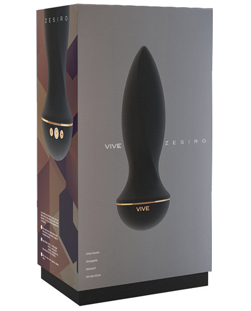 The Vive Zesiro is made of high-end, anti-dust silicone. This luxurious anal vibrator is incredibly smooth but with a wonderful curved ridge texture going in opposite directions on either side for amazing stimulation. This vibrating plug is also a great shower companion due to its waterproof design. A new, patented technology makes the Vive Zesiro unbelievably strong. Enjoy 10 different vibration patterns at the push of a button. Use the plus button to cycle through the patterns and the minus button to go back to the previous function. All Vive products also feature a unique climax function; simply press and hold the plus button and the Vive will go straight to the highest setting.The Vive Zesiro includes a USB charging cord and a light indicator to let you know when the toy is fully charged, active, and when it needs to be charged. Press and hold the power button for 3 seconds to turn the vibrator on and off.This item is made of: Silicone.The overall length is: 5.50". The insertable length is: 4.50". The girth of this item ranges from: 1.00" to 5.00" Black. From Shots America.