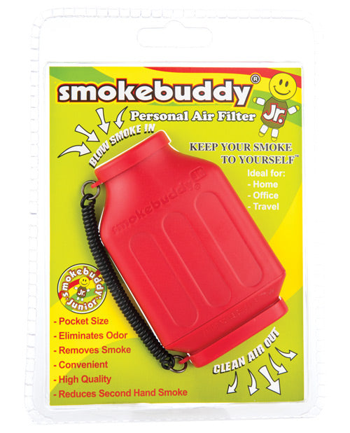 The Smokebuddy Jr is a smaller pocket size, handy, and reliable, life saving air filter. Simply exhale your smoke through your easy-to-use Smokebuddy Jr and odorless air comes out the other end. Smoke where you want, and when you want without anyone knowing the wiser. Keep second hand smoke away from friends, family, and neighbors with your Smokebuddy Jr. Estimated at 200 uses or more. Red.