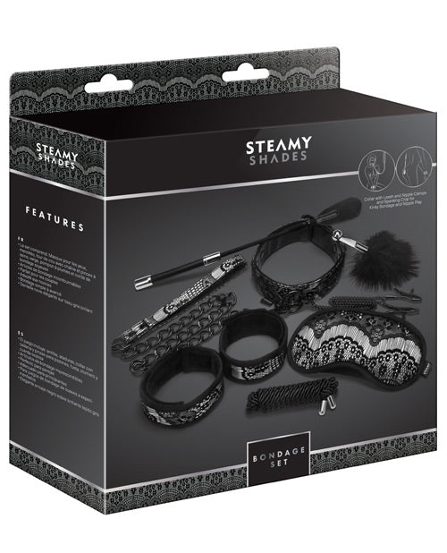 Set includes: Eyemask, Binding Cuffs, Collar with Leash and Nipple Clamps, Crop, Feather Tickler and Silky Bondage Rope, essential bondage tools, perfect for couples, beginners friendly, light to intermediate bondage, elegant sheer black lace overlay on gray fabric. From Steamy Shades.