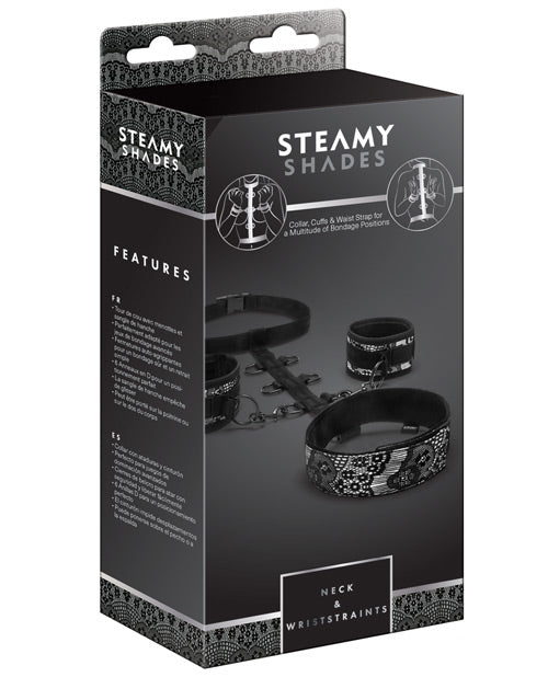 Neck collar and restraints with waist strap, perfect for intermediate bondage play, hook and loop tape closures offer secure hold yet are easily removed, features 6 D-rings for perfect positioning, waist strap prevents shifting, can be worn with central strap on the front/back. From Steamy Shades.