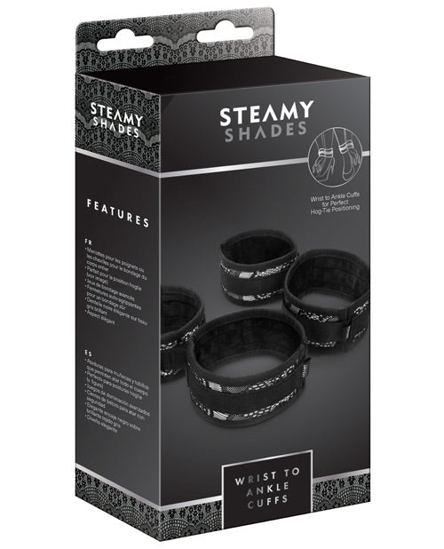 Wrist to ankle cuffs allows for full-body restraint, perfect for hogtie positioning, intermediate bondage play, hook and loop tape closures offer secure hold, elegant sheer black lace overlay on lustrous gray fabric, luxurious look. From Steamy Shades.