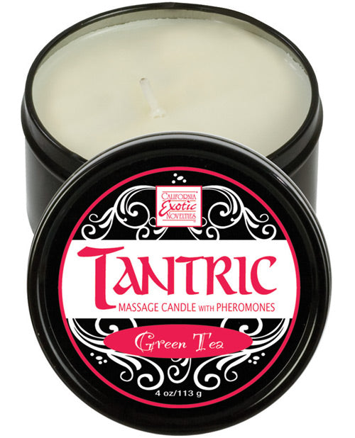 Tantric...The art of sensuality! Heat up your intimate pleasures and reach new heights of intimacy with the outstanding Tantric Soy Candles from California Exotic Novelties; infused with nature's own attractant, pheromones. These Soy Candles liquefy into a warm and moisturizing massage oil that enriches the skin and enhances the touch. Made from 100% natural soy with hemp wicks, candles will burn up to 40 hours. All products are made in the USA, with no animal testing. 4 Oz / 113 g. Green Tea.