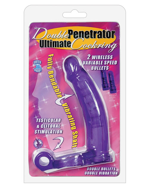 Double your pleasure! No hole goes unfulfilled, thanks to the Double Penetrator Ultimate Cockring. A soft, yet firm jelly cock ring enhances the erection, while a slender, flexible 5.25" x 1" shaft keeps that other opening happily occupied that also has a multi-speed bullet in the base. The second wireless, multi-speed bullet fits directly above the ring, perfectly snug and allowing for intense testicular or clitoral stimulation. This cock ring comes with six watch batteries. It's waterproof too!