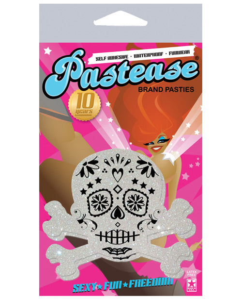 Hand-made in the USA of durable pleather material that forms to curves and resists wrinkling over hardening nipples. Just peel-and-stick on clean, dry skin! All Pastease pasties feature latex-free, medical-grade, waterproof adhesive that stays securely in place for as long as you like and until they are gently removed. Dimensions: 3.3 inches wide X 2.5 inches tall. Coverage Diameter: 1.6 inches. Day of the Dead Skull.