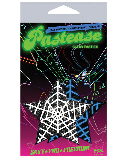 PASTEASE ROCKSTAR PASTIES IN BLACK GLITTER WITH WHITE WEBS THAT GLOW TEAL IN THE DARK ARE MADE OF DURABLE, SMOOTH AND GLITTERY PLEATHER MATERIAL THAT FORMS TO CURVES AND RESISTS WRINKLING OVER HARDENING NIPPLES. MADE READY-TO-WEAR IN THE USA WITH PASTEASE SKIN-SAFE, LATEX-FREE, WATERPROOF ADHESIVE. JUST PEEL-AND-STICK ON CLEAN, DRY SKIN! DIMENSIONS: 3 INCHES WIDE BY 3 INCHES TALL.COVERAGE DIAMETER: 1.55 INCHES. From PCI Fashions