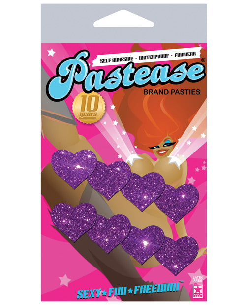 Body Minis: 8 Mini Glitter Hearts are hand-made in the USA of durable, no-mess glitter pleather material that forms to curves and resists wrinkling over hardening nipples. Just peel-and-stick on clean, dry skin! All Pastease feature latex-free, medical-grade, waterproof adhesive that stay securely in place for as long as you like and until they are gently removed. Dimensions: 1 inch wide x 1 inch high. Purple.