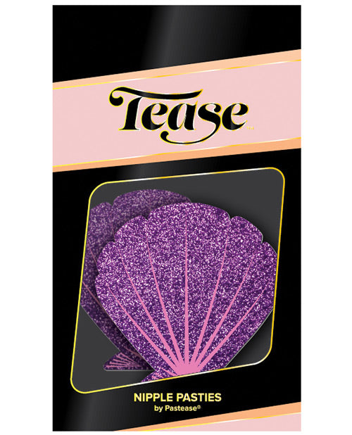 Seashell nipple pasties in purple and pink are made of durable, no-mess glitter pleather material that forms to curved and resists wrinkling over hardening nipples. Just peel-and-stick on clean, dry skin. Features latex-free, medical-grade, waterproof adhesive that stays securely in place for as long as you like and until they are gently removed. 3.1 inches wide by 3 inches tall. 2.8 inches of coverage. Made in the USA.