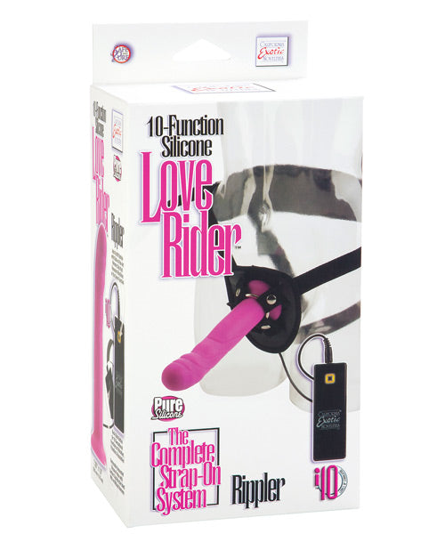 The 10-Function Silicone Love Rider Rippler from Cal Exotics is the complete strap-on system. It comes with a premium, solid, silky-smooth, unscented Silicone probe with reverberating vibrations throughout the shaft. The supportive, premium, form fitting, full body adjustable harness fits up to 70"/177.75 cm waist. The removable probe may be used with or without the harness. The Performance Plus controller with 10 powerful functions of vibration, pulsation, and escalation, auto on/off button, and state-of-the-art memory chip that resumes last function used. Silicone (dong) ABS (controller) PU (harness) Polyester (lining) POM (buckles) PP (straps) Nickel-Free Alloy (ring). Requires 2 AA batteries. 7.25" x 1.5"/18.5 cm x 3.75 cm (probe).