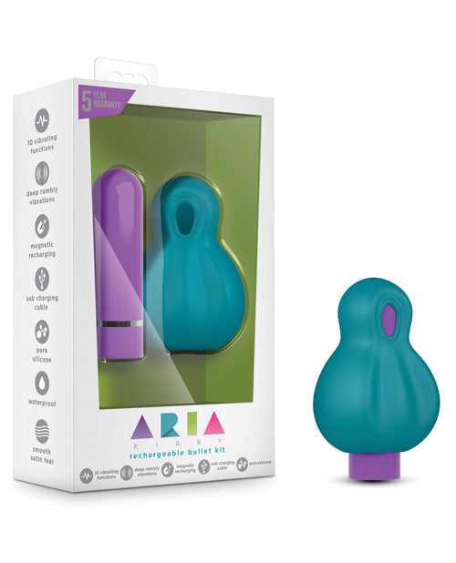From the Aria collection of fun vibes. The Kirby Rechargeable bullet kit features powerful deep rumbly vibrations. The Kirby fits perfectly in your hand. Press and hold 3 seconds to power on the vibrator. The button allows you to choose from 5 speed settings as well as 5 unique vibrating patterns. The silicone sleeve is soft and has a soft satiny feel. Run it tantalizing across your or your partner's body. Teasing him/her with the vibrations. Squirm in delight as the rumbly vibrations shake you to your core. Use the vibrating bullet separately for even more direct stimulation. IPX 7 waterproof so it is fully submersible. Play with it in the tub while relaxing in your bubble bath. Includes a USB charging cable that magnetically attaches to the product for convenient charging. Product is responsibly made from lab tested body safe material. Materials ABS, Silicone.