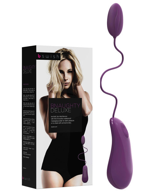 Bnaughty Deluxe is designed to pander to your deepest whim with its compact oval shape, its smooth touch, and deep vibrations of the waterproof wonder. Be in control, or let your partner play with its 6-functon remote operation. With classic bullet styling and featuring smooth ridges on one side of the bullet, the Bnaughty Deluxe fits against your body perfectly, no matter where you choose to stroke. It is fabulous for stimulation when placed against the clitoris or nipples due to its pinpoint pulsating precision. The head of the penis and behind the testicles can also be stimulated using the silicone bullet. This massager is perfect for couples play or extremely satisfying during solo stimulation. Made from hygienic, nonporous silicone materials, and ABS plastics. Waterproof. Requires 2 AAA batteries (not included)