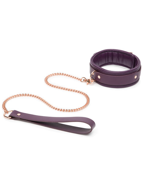 Fifty Shades Cherished Collection.Handcrafted leather collar and chain for erotic restraint and domination play. Ornate buckle and hardware in rose-gold metal to complement the dark.purple leather collar. ¢ Wide choice of holes in the supple strap make collar a comfortable fit for.most sizes. Long metal chain lead for enhanced role play domination . D-ring on collar offers additional bondage opportunities. Supplied in a luxurious envelope-style velveteen bag.Embossed leather collection tag