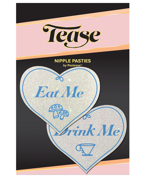 Eat Me Drink Me White Glitter Heart Pasties hand-made in the USA of durable no-mess glitter pleather waterproof material that forms to curves to resist wrinkling over hardening nipples. Just peel-and-stick on clean, dry skin! All Pastease pasties feature latex-free, medical-grade, waterproof adhesive that stays securely in place for as long as you like and until they are gently removed. Dimensions: 2.5 inches tall x 3 inches wide Coverage Diameter: 1.8 inches
