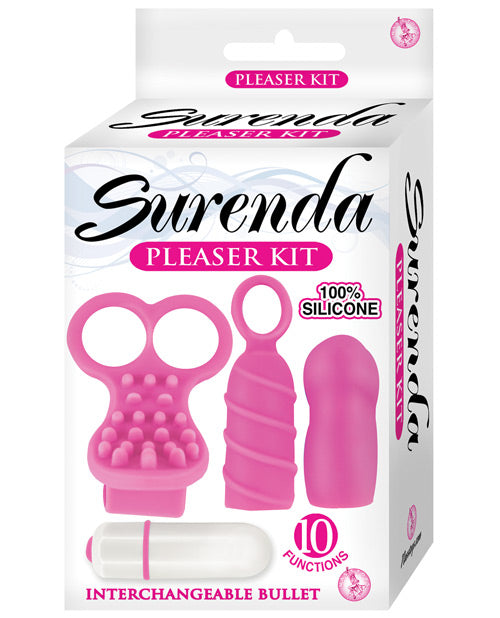 The Surenda from Nasstoys. 10 Function bullet,100% Silicone,3 interchangeable sleeves: Finger Sleeve, Twisty Sleeve, Nubby Sleeve Waterproof,Phthalates free,Materials: Sleeves-Silicone, Bullet-ABS Sizes: Nubby Sleeve-3", Twisty Sleeve-3", Finger Sleeve-2.125", Bullet Length-2.375", Bullet Width-0.75", Bullet Circumference-2.5" 3 LR44 (AG13) batteries included.